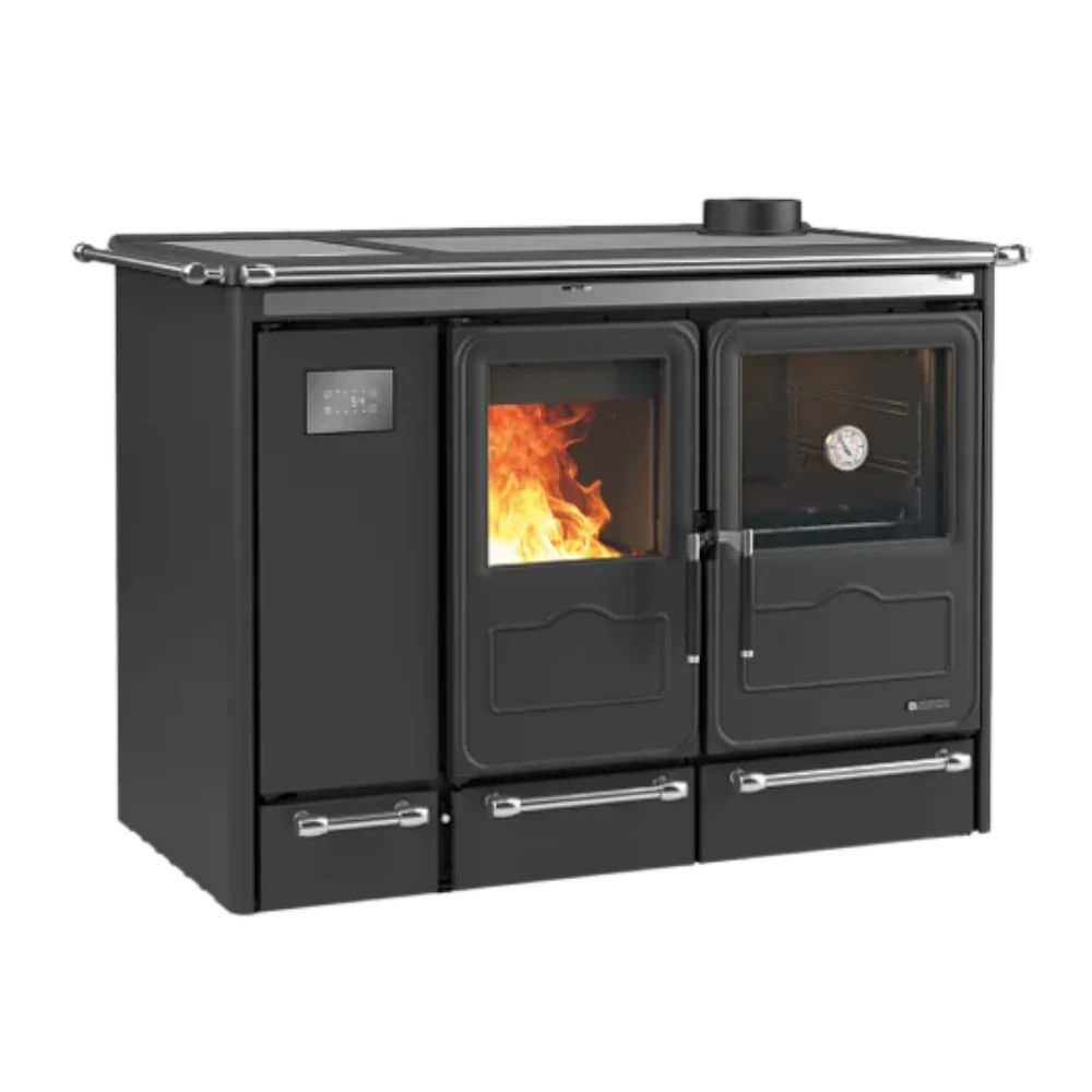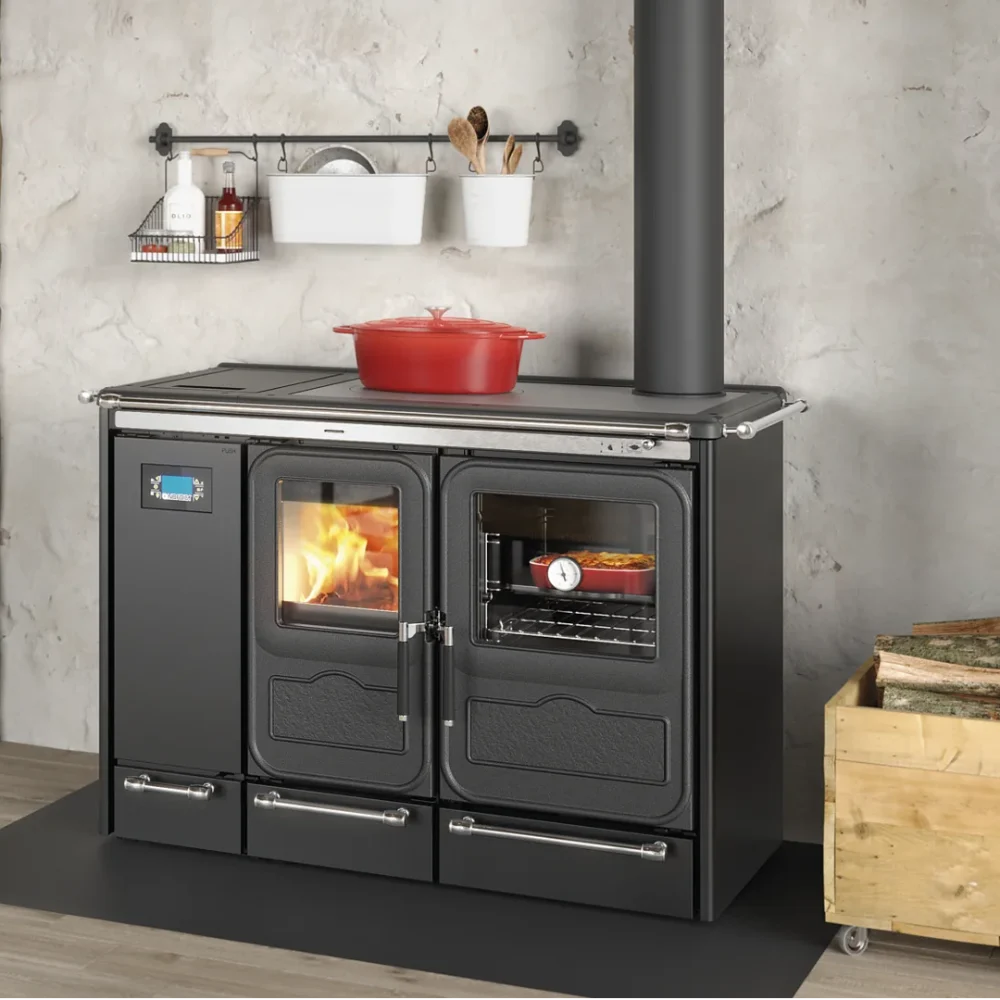 Etagenherd mit drucklosem Wärmetausche. Herdplatte aus nichtrostendem geschliffenem Guss. Türen und Rost ebenfalls aus Guss. 10 + 5 kW Wasser- und Konvektions-Leistung. Touch-Display für die Thermostatsteuerung: • Wasserstand für Wärmetauscherwasserbad, Backofenbeleuchtung, Vorlauftemperatur, Systempumpe, 3-Wege-Ventil-Steuerung